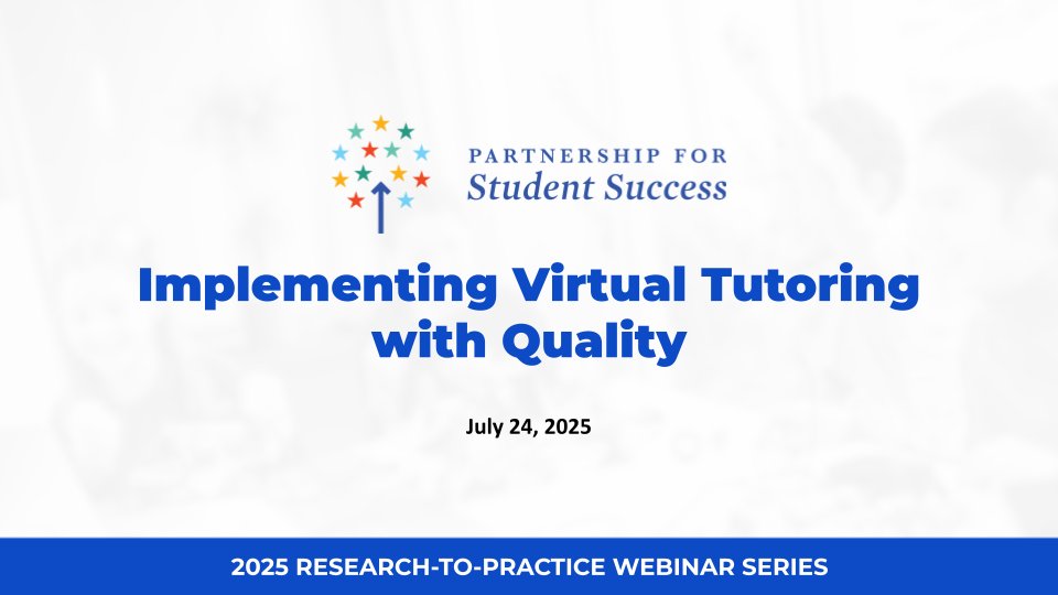 In this first installment of the Research-to-Practice webinar series, hosted by the Partnership for Student Success on July 24, 2025, we were excited to discuss recent research on live-online tutoring and how districts and nonprofit organizations can implement virtual tutoring aligned with evidence-based practices.